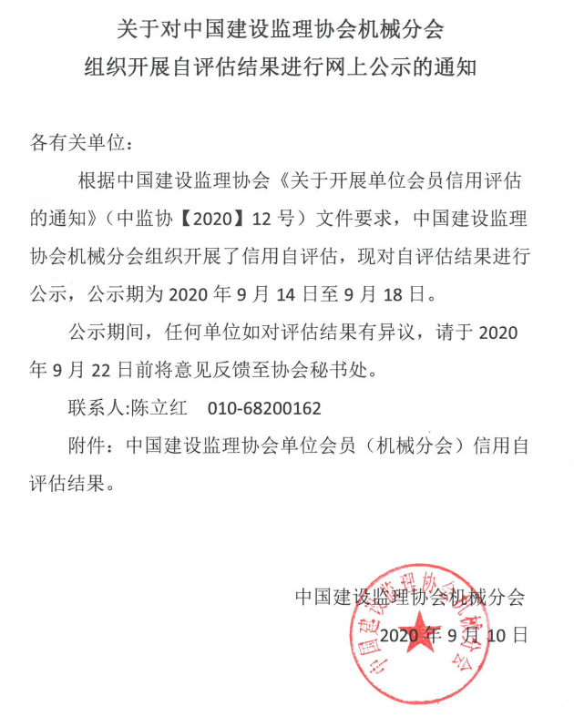 關于對中國建設監理協會機械分會組織自評估結果進行網上公示的通知