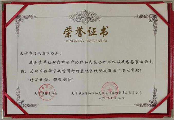 天津市建設監理協會榮獲“天津市社會力量參與脫貧攻堅助力掛牌督戰”榮譽證書