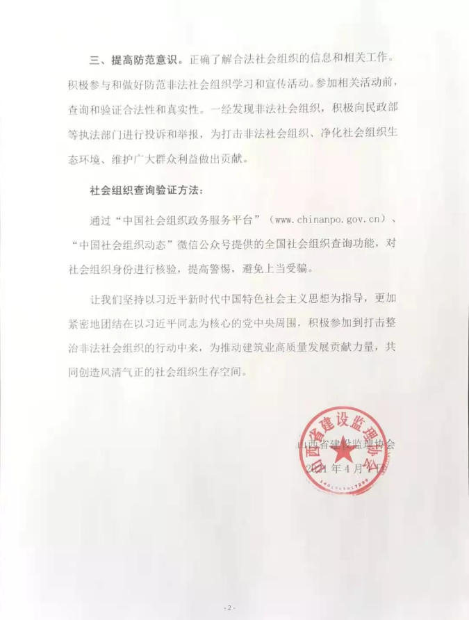 近日,民政部等22部門聯合印發《關于鏟除非法社會組織滋生土壤 凈化社會組織生態空間的通知》(以下簡稱《通知》),要求社會組織要依法登記、依法運作,做到“六不得一提高”,不與非法社會組織有任何勾連或合作。多年來,建筑行業非法組織以假亂真、招搖撞騙,給廣大企業和從業人員造成不必要困擾和損失。為認真貫徹落實《通知》精神,提高全行業的防范意識、抵制非法社會組織的不法活動,徹底鏟除非法社會組織滋生土壤,凈化社會組織生態環境,結合監理行業實際情況,山西省建設監理協會發出以下倡議:
