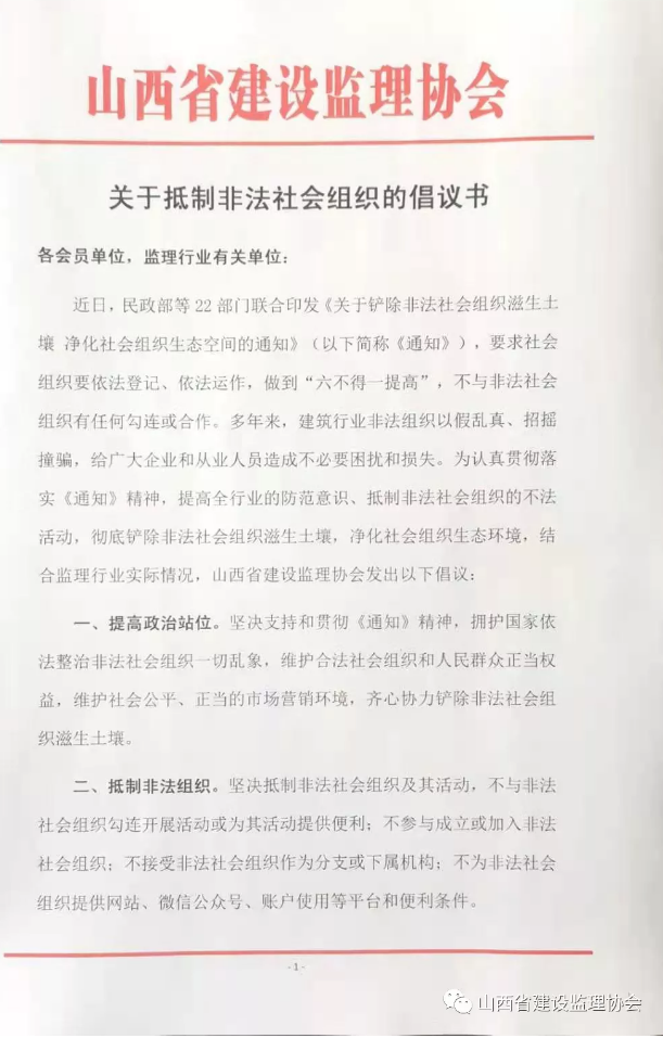 山西省建設監理協會關于抵制非法社會組織的倡議書