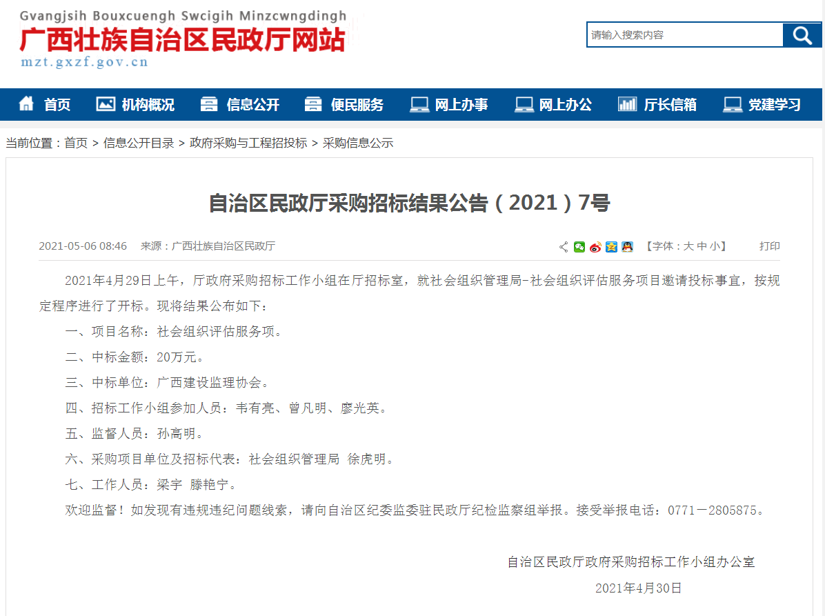 2021年4月29日,廣西民政廳2021年社會組織評估服務項目經招標、民政廳采購招標工作小組評審,我會從參與投標的機構中脫穎而出,成功中標,并在廣西民政廳網站公示公告,再次成為廣西民政廳指定全區性社會組織第三方評估機構。