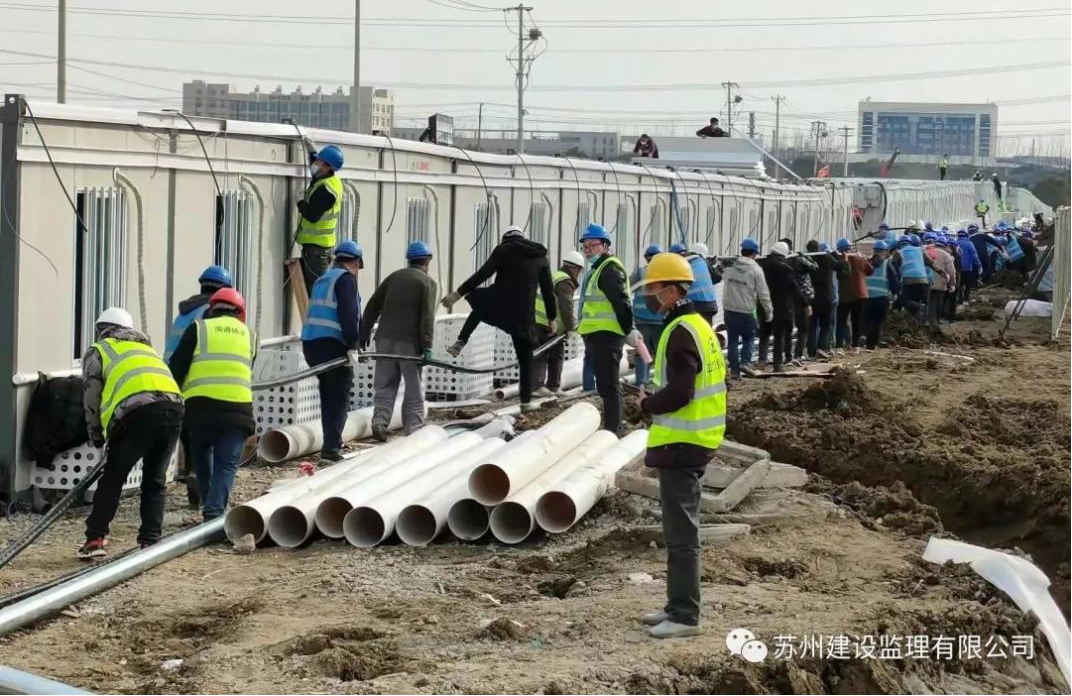 抗疫安置房建設 根據抗疫防疫需要,蘇州市市政建設管理處組織建設新冠抗疫安置房項目,共計建設約600間箱式房,2月17日晚八點開始,2月23日完成。工期緊,任務重,施工單位組織多家施工班組實行三班倒施工,最多時日投入約2000人次。蘇州建設監理有限公司選派出7人進駐現場日夜工作,提供專業志愿服務,白班4人,夜班3人。經過與風雪嚴寒、勞累困乏作斗,艱苦奮戰,歷時6個日夜工作,終于完成建設任務。
