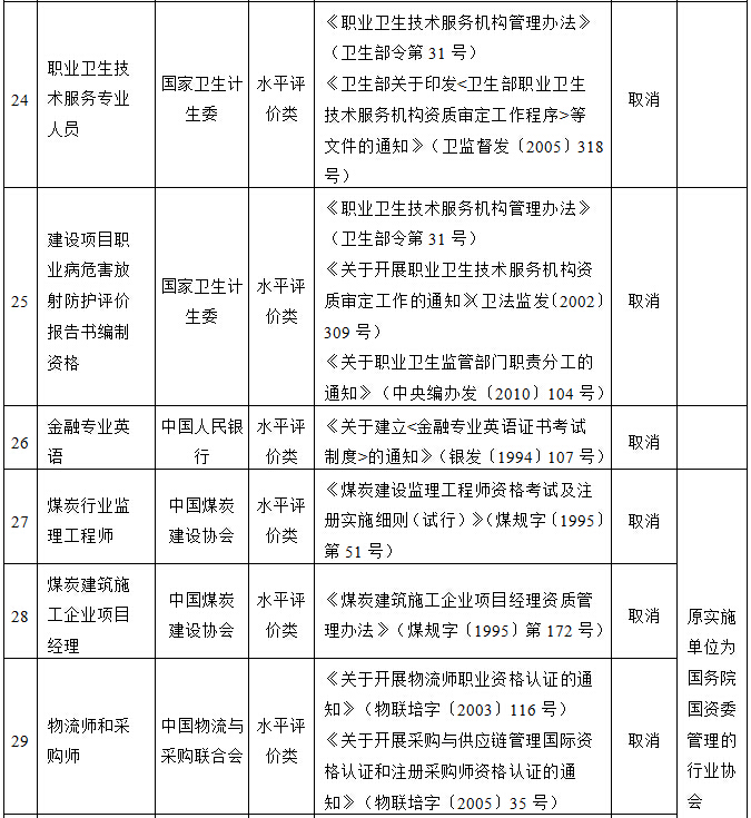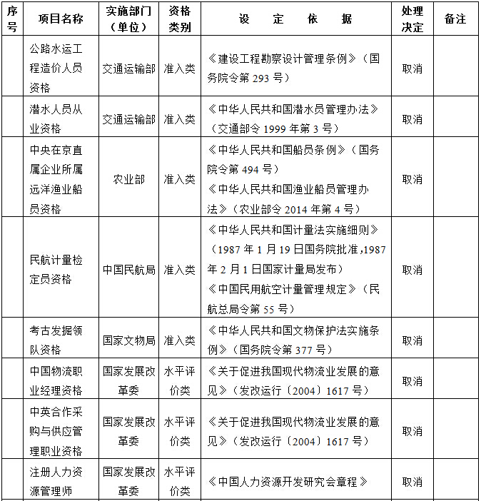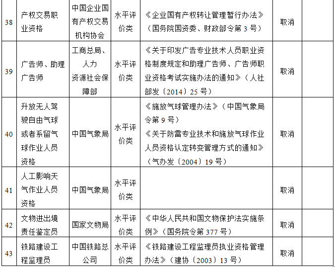 一、取消的專業技術人員職業資格許可和認定事項(共計43項,其中準入類5項,水平評價類38項)