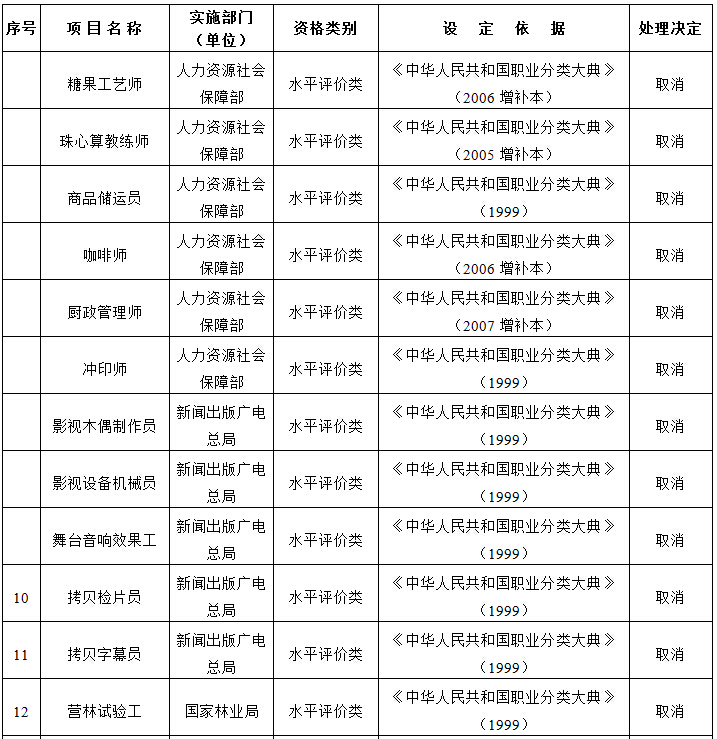 二、取消的技能人員職業資格許可和認定事項(共計18項,均為水平評價類)