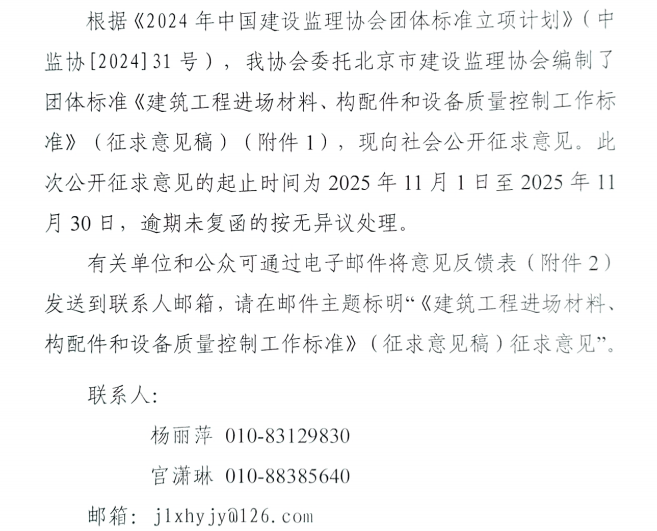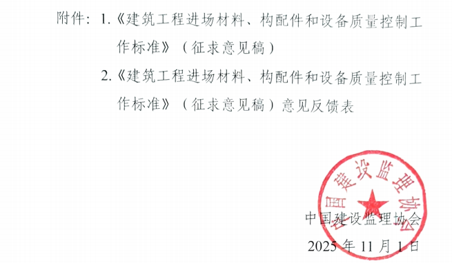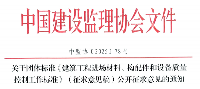 關于團體標準《建筑工程進場材料、構配件和設備質量控制工作》(征求意見稿)公開征求意見的通知