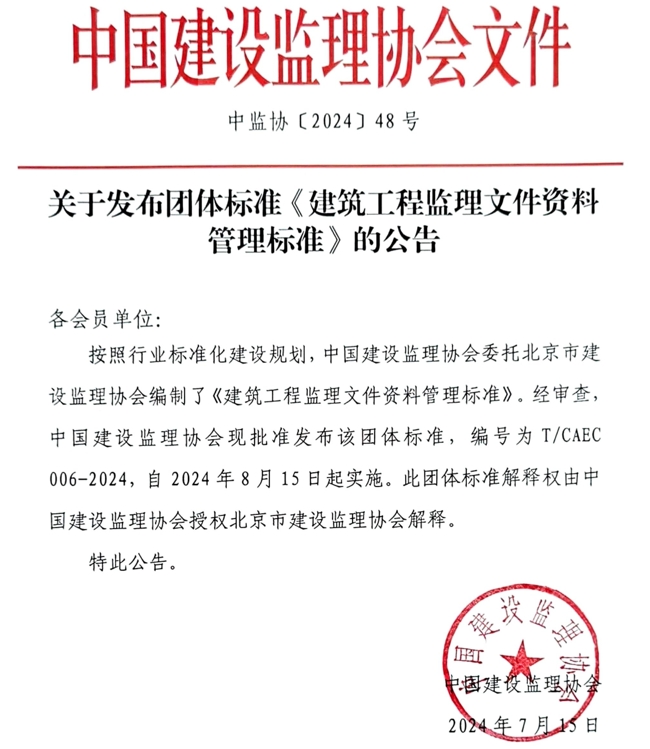 關(guān)于發(fā)布團(tuán)體標(biāo)準(zhǔn)《建筑工程監(jiān)理文件資料管理標(biāo)準(zhǔn)》的公告
