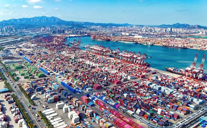 貨輪在青島自貿片區裝卸貨物(2025年11月5日攝,無人機照片)。新華社發(張進剛攝)
