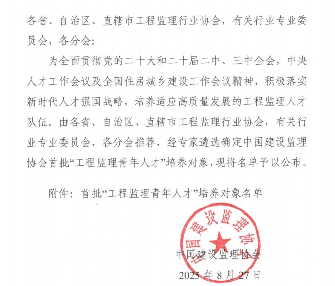 關(guān)于公布中國建設(shè)監(jiān)理協(xié)會(huì)首批“工程監(jiān)理青年人才”培養(yǎng)對(duì)象名單的通知