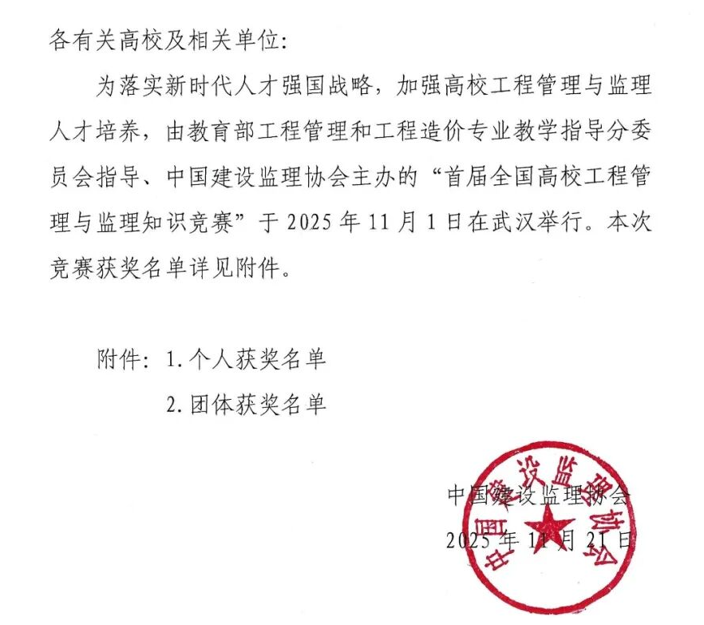 關于公布首屆全國高校工程管理與監理知識競賽獲獎名單的通知