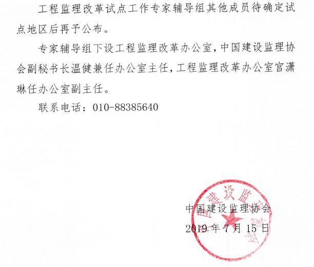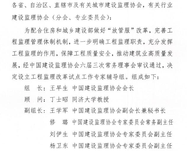 中國(guó)建設(shè)監(jiān)理協(xié)會(huì)關(guān)于設(shè)立工程監(jiān)理改革試點(diǎn)工作專家輔導(dǎo)組的通知