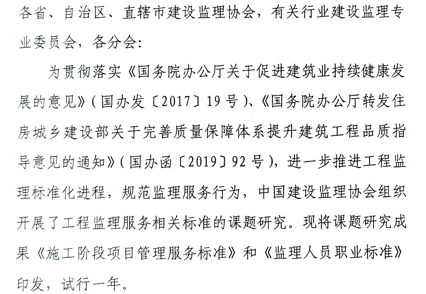 中國建設監理協會關于試行《施工階段項目管理服務標準》和《監理人員職業標準》的通知