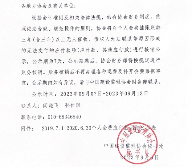 中國建設監理協會關于核銷長期掛賬—應付款和其他應付款(個人會費)的公示