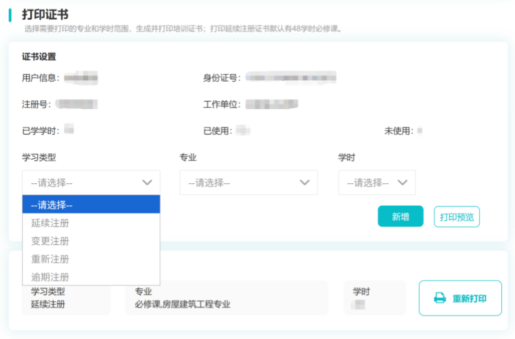 升級證書打印功能,支持按學習類型(延續注冊、變更注冊等)、專業類別(房屋建筑工程、通信工程、機電安裝工程等)篩選。可新增多個專業證書分別打印,打印前支持信息預覽核對;歷史打印記錄可追溯,支持重新打印,切實解決舊系統證書打印適配性不足、信息修改不便等問題。
