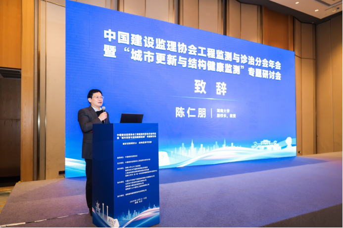 開幕式環節,湖南大學副校長陳仁朋教授致歡迎辭,強調工程監理與結構健康監測是支撐城市更新戰略的關鍵力量,湖南大學將積極推動學科交叉融合,培養新時代土木人才,為行業變革提供支撐和保障。